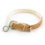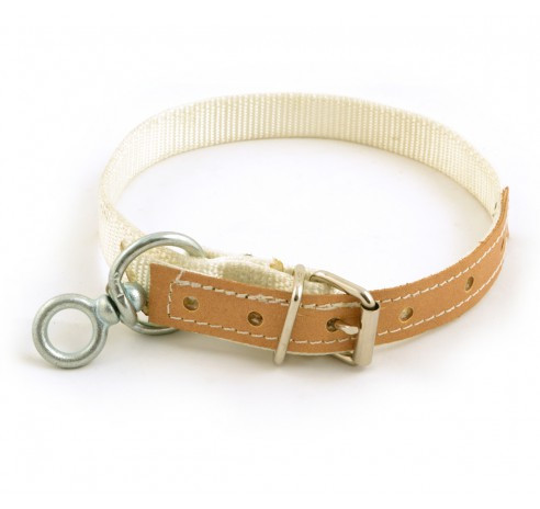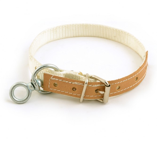 Collier en nylon, renforcé en cuir sur la partie du réglage, muni d’un touret pour l’attache. Fabrication artisanale.